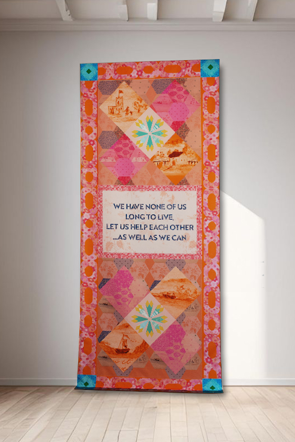 Death, a recurring theme in Victorian life due to shorter lifespans, is represented by a skeleton.The Brontë children had to deal with death from an early age - they lost a sibling and their mother whilst young and then none of them lived beyond 40, making their legacy and achievements all the more remarkable. The idea of making the most of our limited time is emphasised with a quote from Shirley, on the pink banner accompanying the blocks.The banners deliberately reference the wall hangings seen in churches and hand sewn banners displayed at demonstrations.