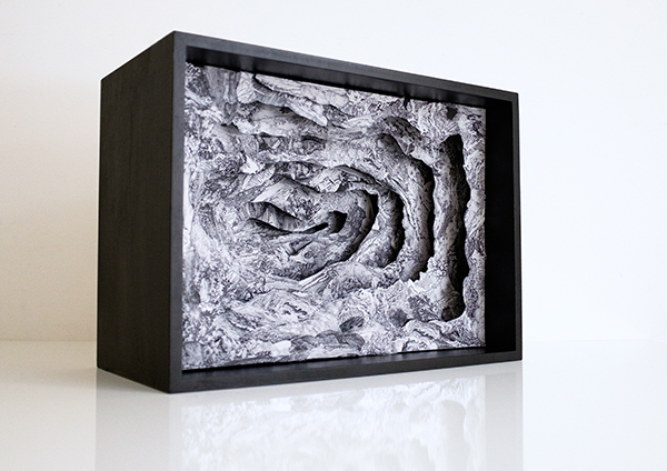 Contained within a wooden frame, these intricately layered collage pieces create a surreal, dream-like landscape. These works explore the notion of different levels of knowing and consequent seeing in the world. The human desire to control or tame nature has, over time erroded different ways of realting to and understanding it. Can we recover this lost knowing?